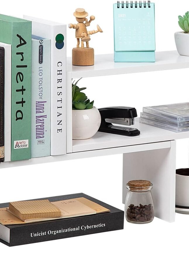 🔧 Adjustable Design: This desk book organizer allows you to reconfigure the shelves at any time. One end is stationary and the other can be moved back and forth to organize exactly how you want.