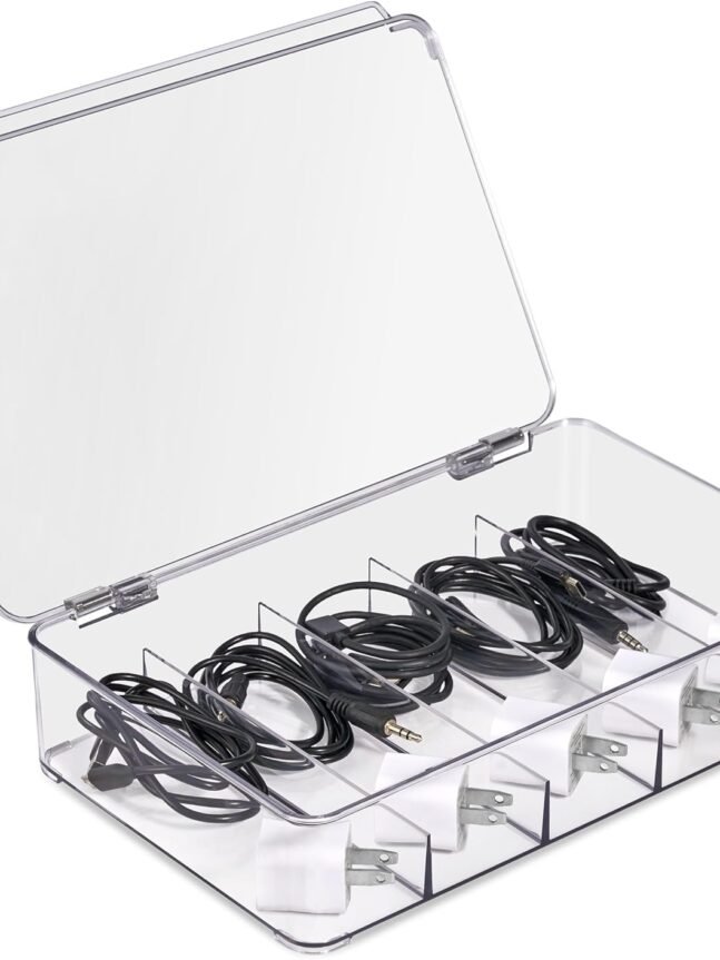 Dependable Protection with a Lid: its sturdy plastic structure ensures heavy duty performance, also being waterproof and dust proof; The cable organizer box comes with a protective lid for clean storage of your items; Featuring a secure storage setting which is ideal for storing and securing cables, power cords, power banks, AC adapters, headphones, phone chargers and more