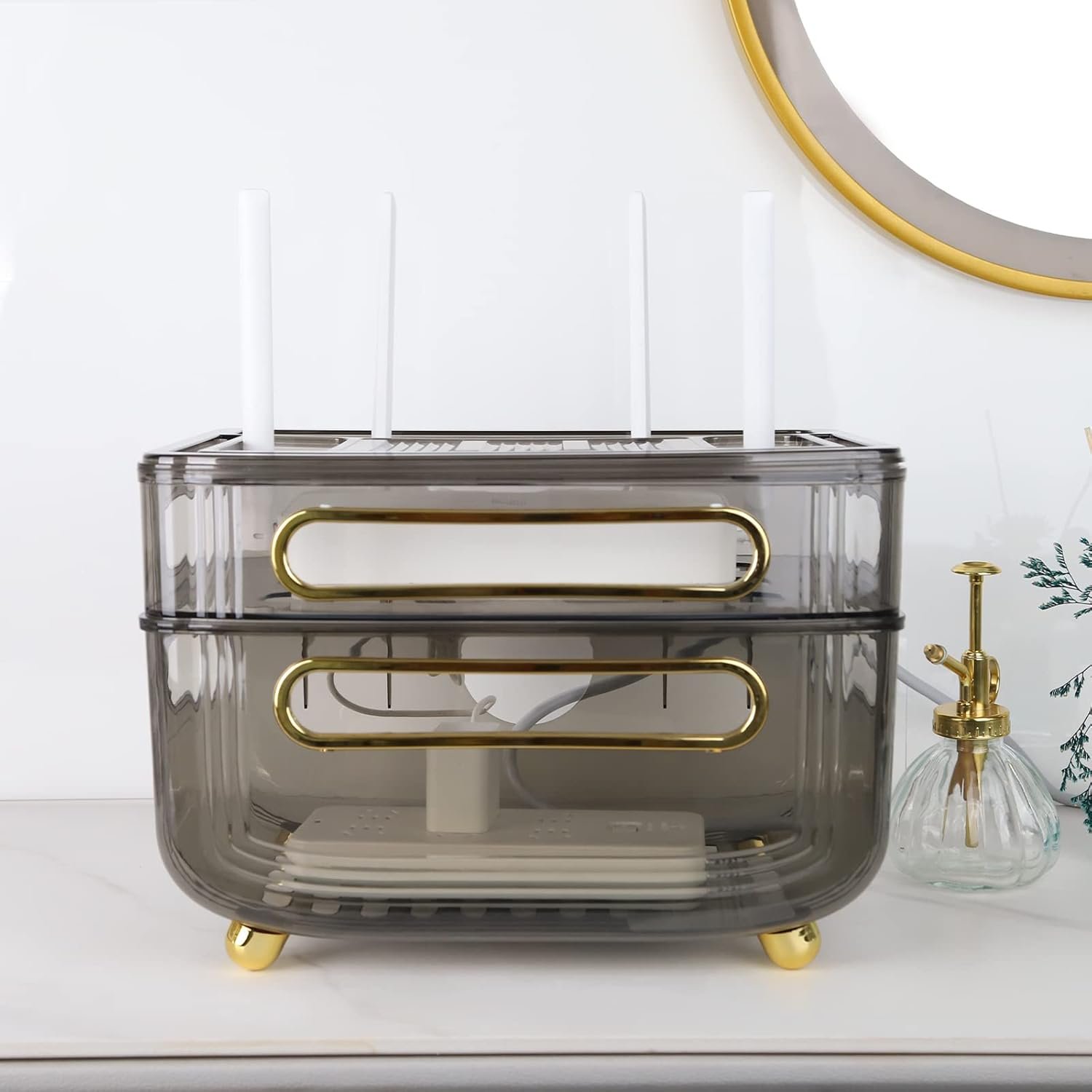 【Wide Applications】Two-layer storage box with a cover is able to store WiFi routers, power boards, USB cables, surge protectors, adapters, etc. It can save more public environment, keep it clean, is a excellent tool for home or office.