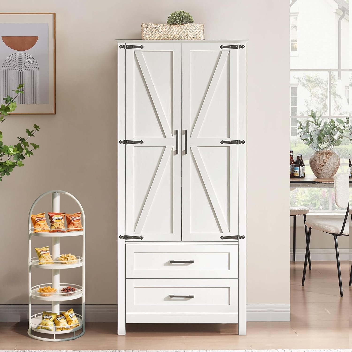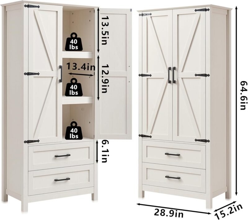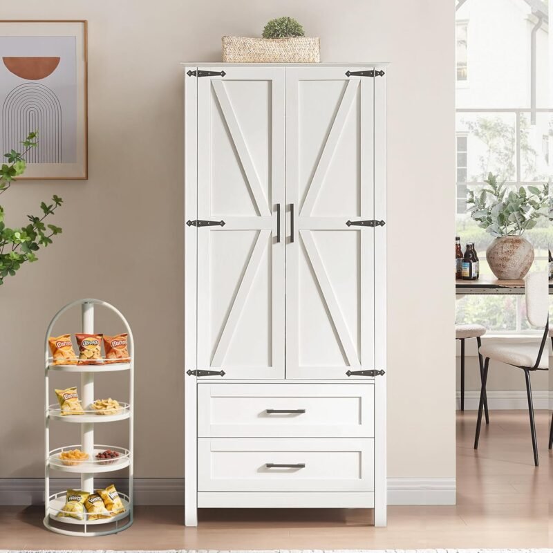 • Farmhouse Pantry Storage Cabinet – Add rustic charm and smart storage to your space with this white kitchen pantry cabinet. Designed with classic barn-style doors and clean lines, it features 2 drawers and 2 adjustable shelves, perfect for organizing dry goods, dishes, or daily essentials