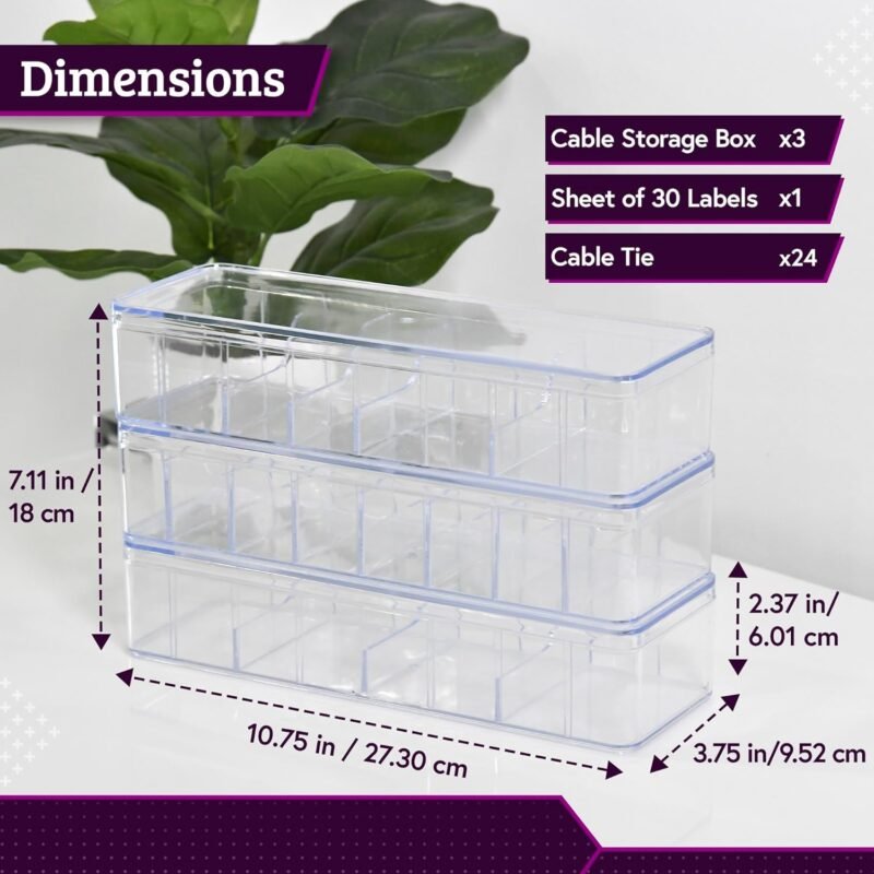 • The package: Includes 3 pcs Cord Organizer Box with Lids, 24 White Rubber Cable Ties, 1 Label Sheet with 30 Images of USB types cables. Our Cord Management Box helps to keep your USB cables and similar accessories in our acrylic cable management box for safe keeping and easy retrieval from your drawer. This wire organizer box comes with a sheet of labels for easy identification of your USB cables. Each Box measures (10.75” x 3.75” x 2.38”).