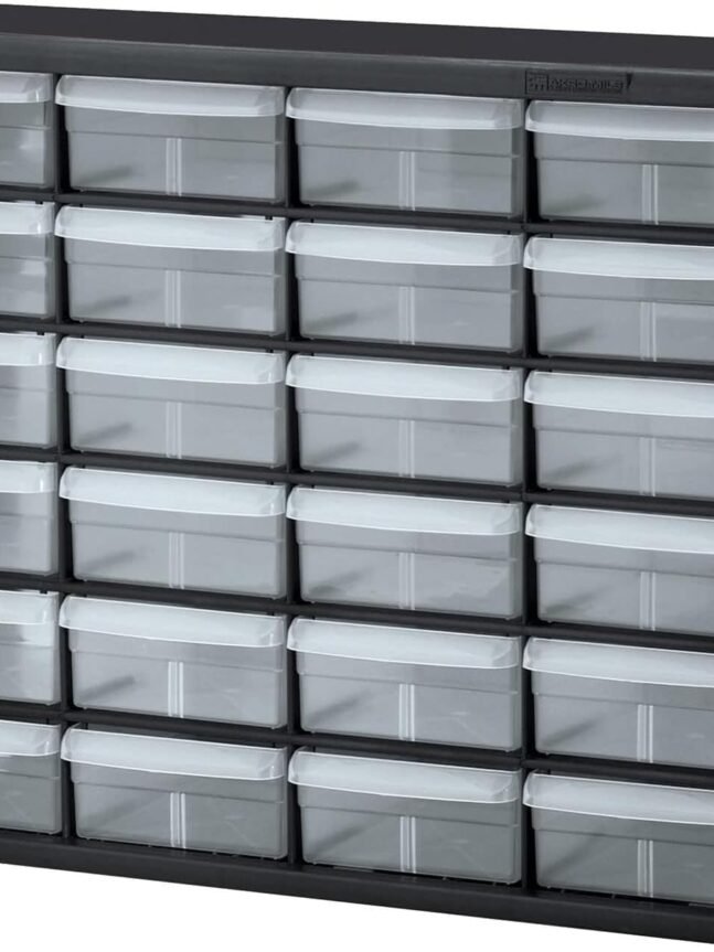 HEAVY DUTY CABINET WITH 24 DRAWERS: The 24-drawer small storage cabinet is made in the U.S.A. from rugged, high-impact plastic and measures 20" W x 6" D x 16" H; Organizer drawers - 6" x 4-1/2" x 2-3/16"