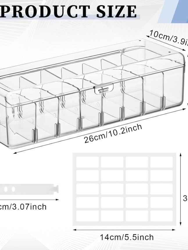 【DIMENSION】: The overall dimension ( L x W x D): 10.6 x 6.6 x 2.7 Inches ( 27 x 17 x 7 cm); Compartment ( L x W x D): 2.3 x 6.2 x 2.3 Inches ( 6 x 16 x 6 cm). Package includes 2pcs of plastic cable organizer box with 4 drawers and 40pcs of wire ties, there are 3 colors of the drawer for you to choose, beige, clear and white, modern and stylish.