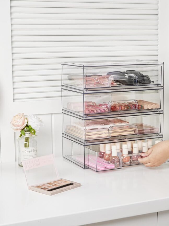 [Stackable Design] Come with 2 drawer storage organizers, the outside box measures 7.5"D x 12.1"W x 3.5"H,the drawer measures 7.2"D x 11.6"W x 2.5"H,it is usable size.The storage containers are stackable, vertical storage will save a lot of space. You can also use them side by side. Put your small objects on top of acrylic bins to make your countertop space more tidy.